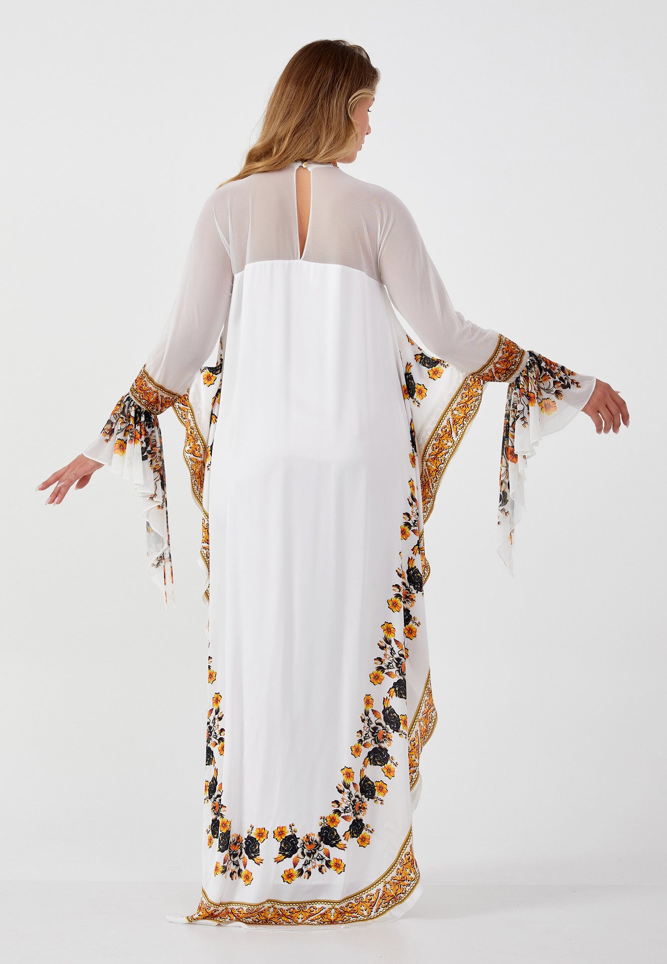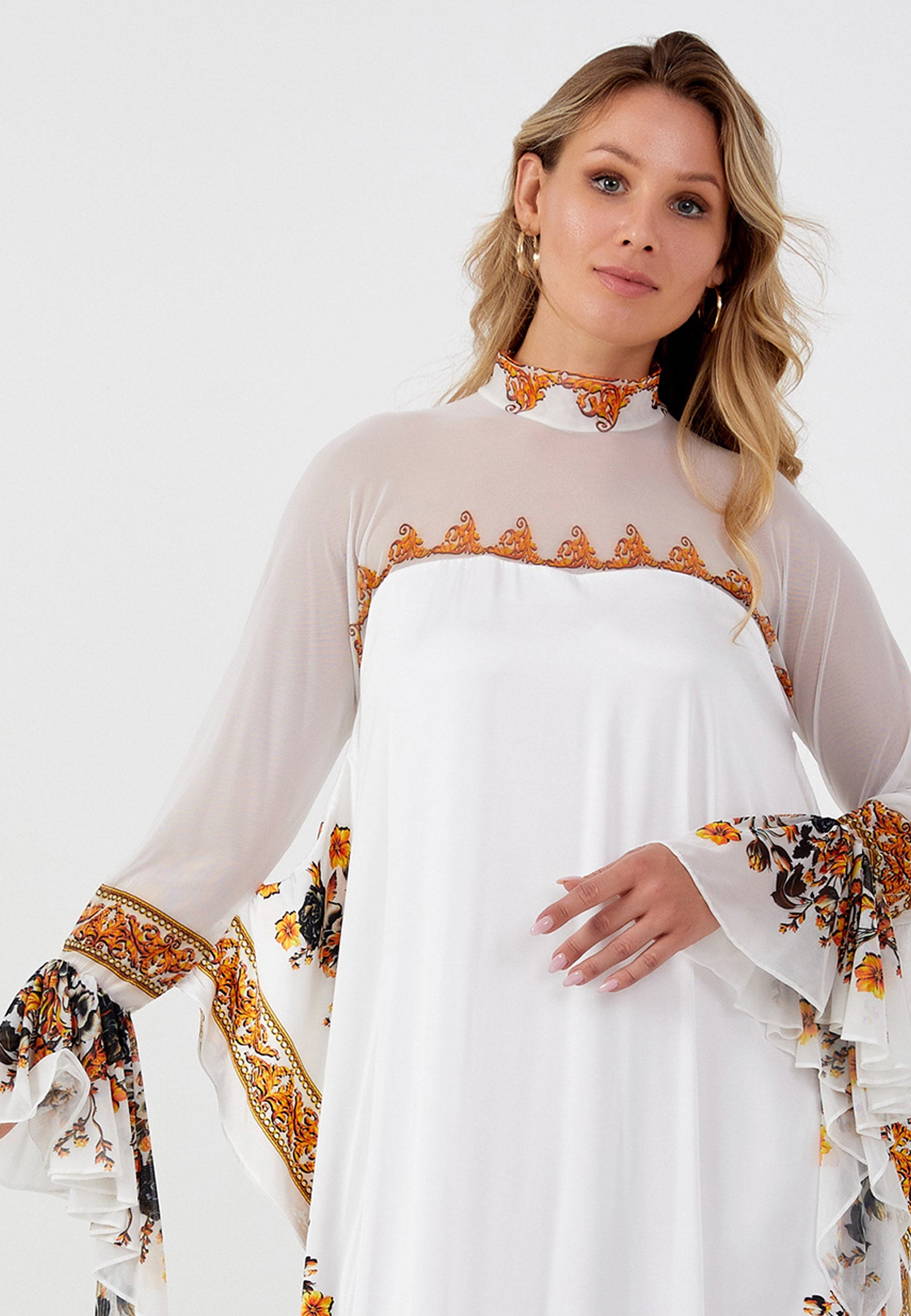 Radiate timeless sophistication in the Graceful Elegance High-Neck Maxi Dress—a stunning fusion of modern minimalism and vintage charm. This flowy, full-length dress features a delicate sheer yoke and high-neck collar, adorned with intricate ornamental golden embroidery for an opulent touch. The long, flared sleeves with ruffled cuffs enhance its regal appeal, while the soft, lightweight fabric... read more