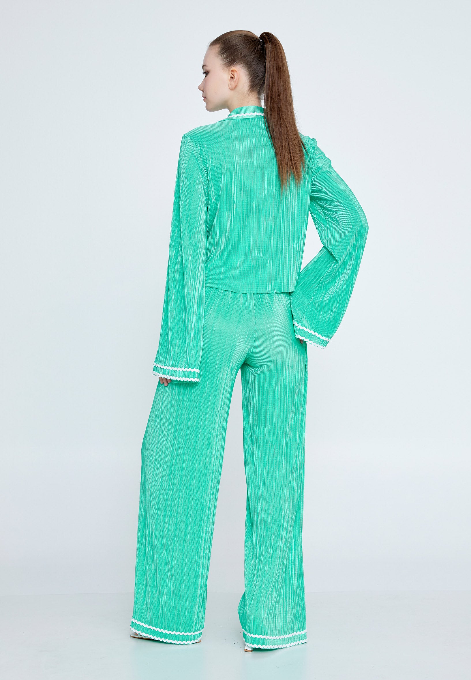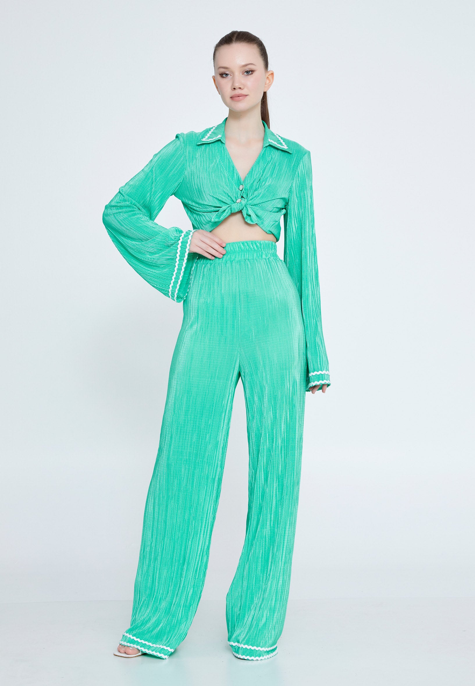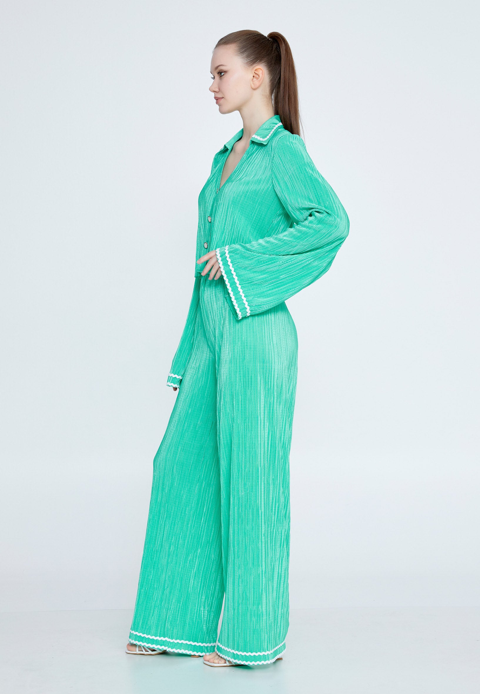 Step into effortless elegance with this mint green wide-leg jumpsuit, designed for fashion lovers who crave both comfort and style. Featuring a luxe pleated texture, exaggerated bell sleeves, and a flattering button-down front, this piece channels retro glam with a modern twist. White scalloped trim along the collar, cuffs, and hem adds a fresh, playful detail, making it perfect for resort wear...