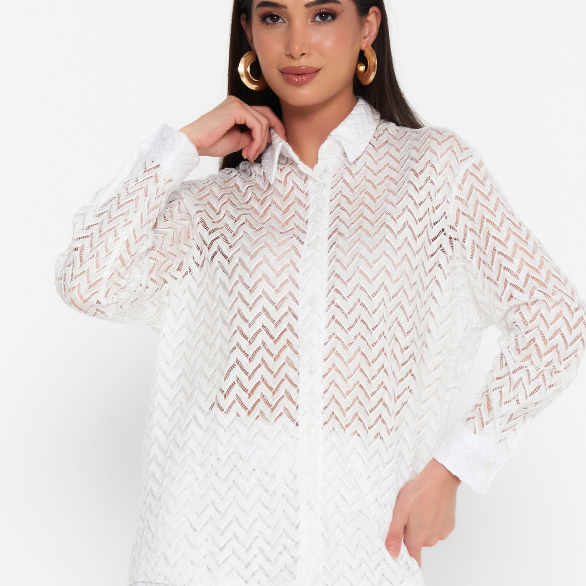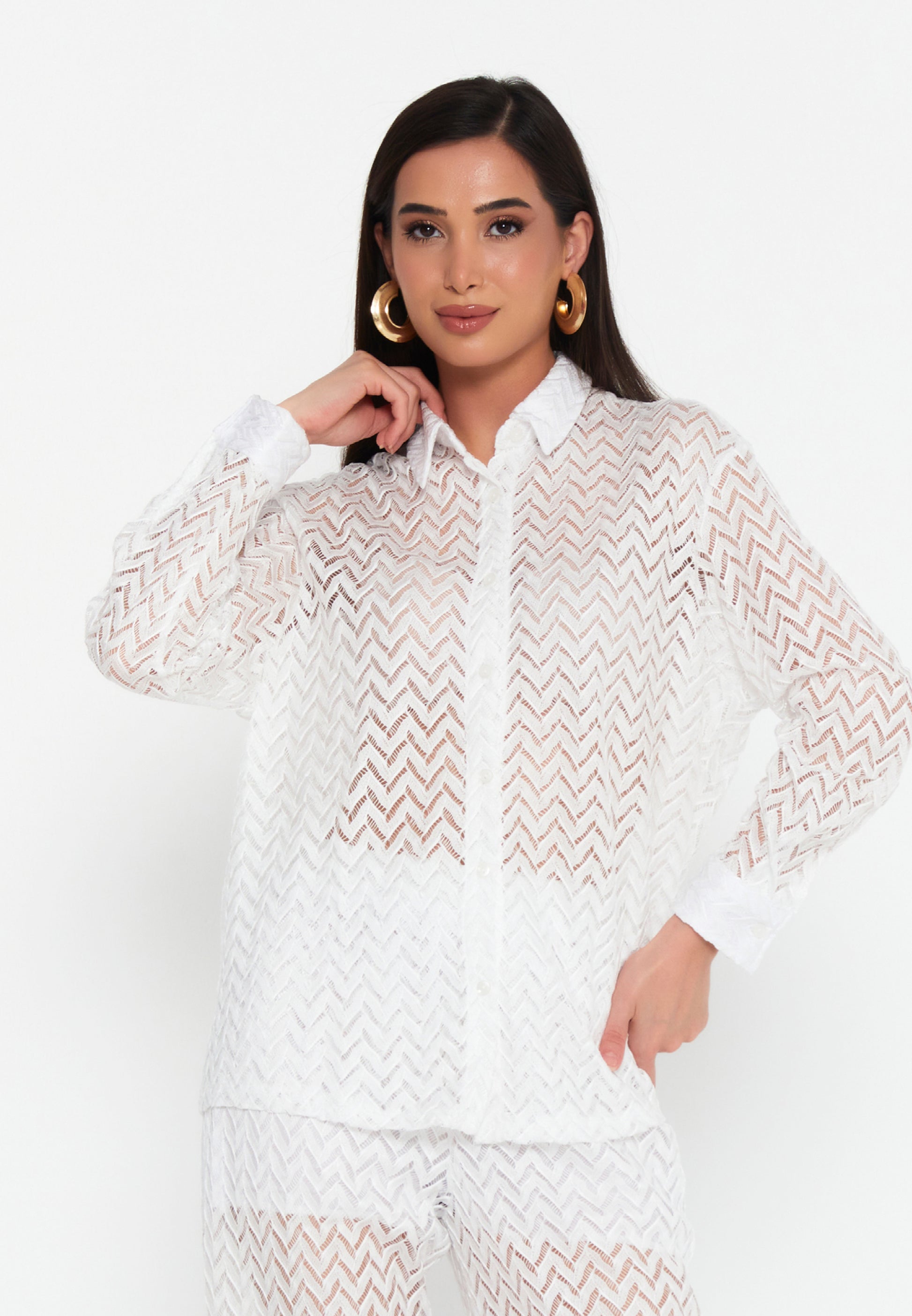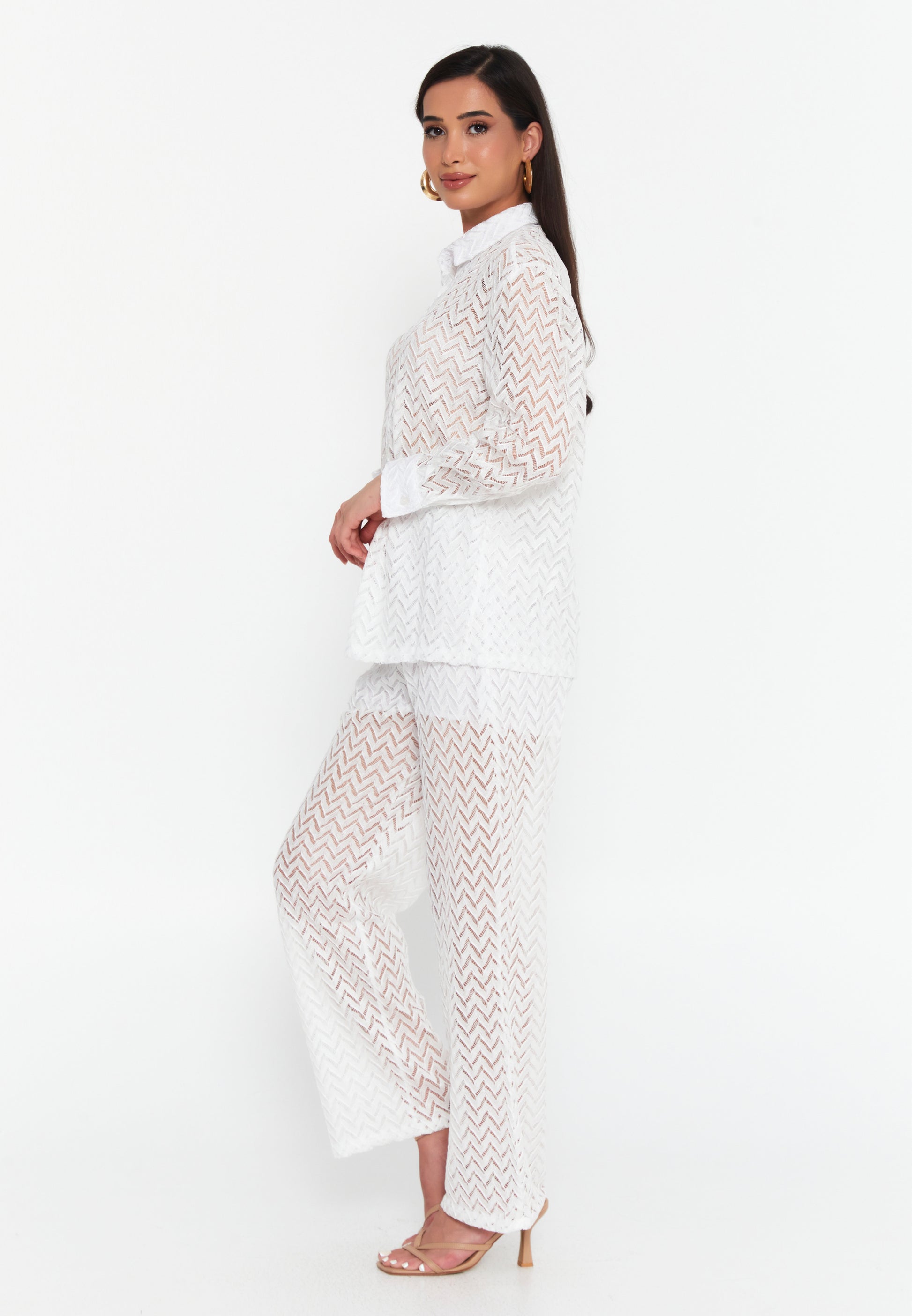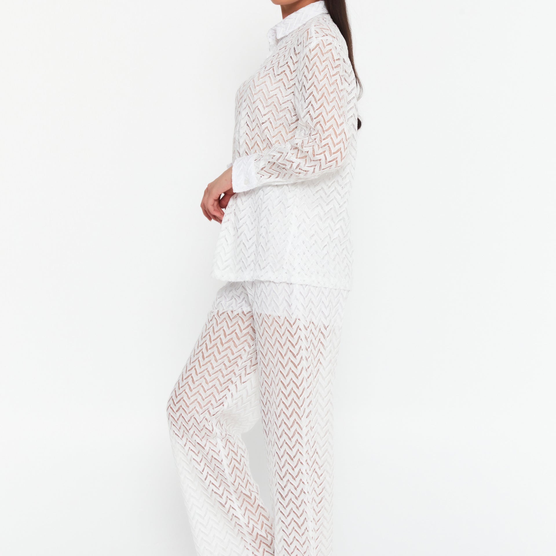 Embrace the ultimate coastal aesthetic with our Coastal Chic Co-Ord Set. This stunning two-piece ensemble is perfect for your next vacation, beach club outing, or warm-weather event. Made from a beautiful white sheer knit with a chic chevron pattern, the set includes a classic button-down shirt and matching wide-leg trousers. Designed to be worn as a stylish cover-up over swimwear or with a sim...